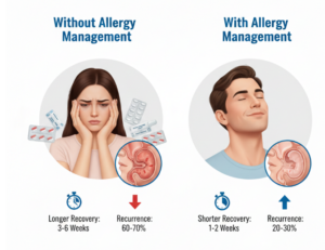 This is exactly what leads to the cycle many patients describe, sinusitis coming back every 2 to 3 months despite taking antibiotics. In most of these cases, unmanaged allergies are driving the recurrence.